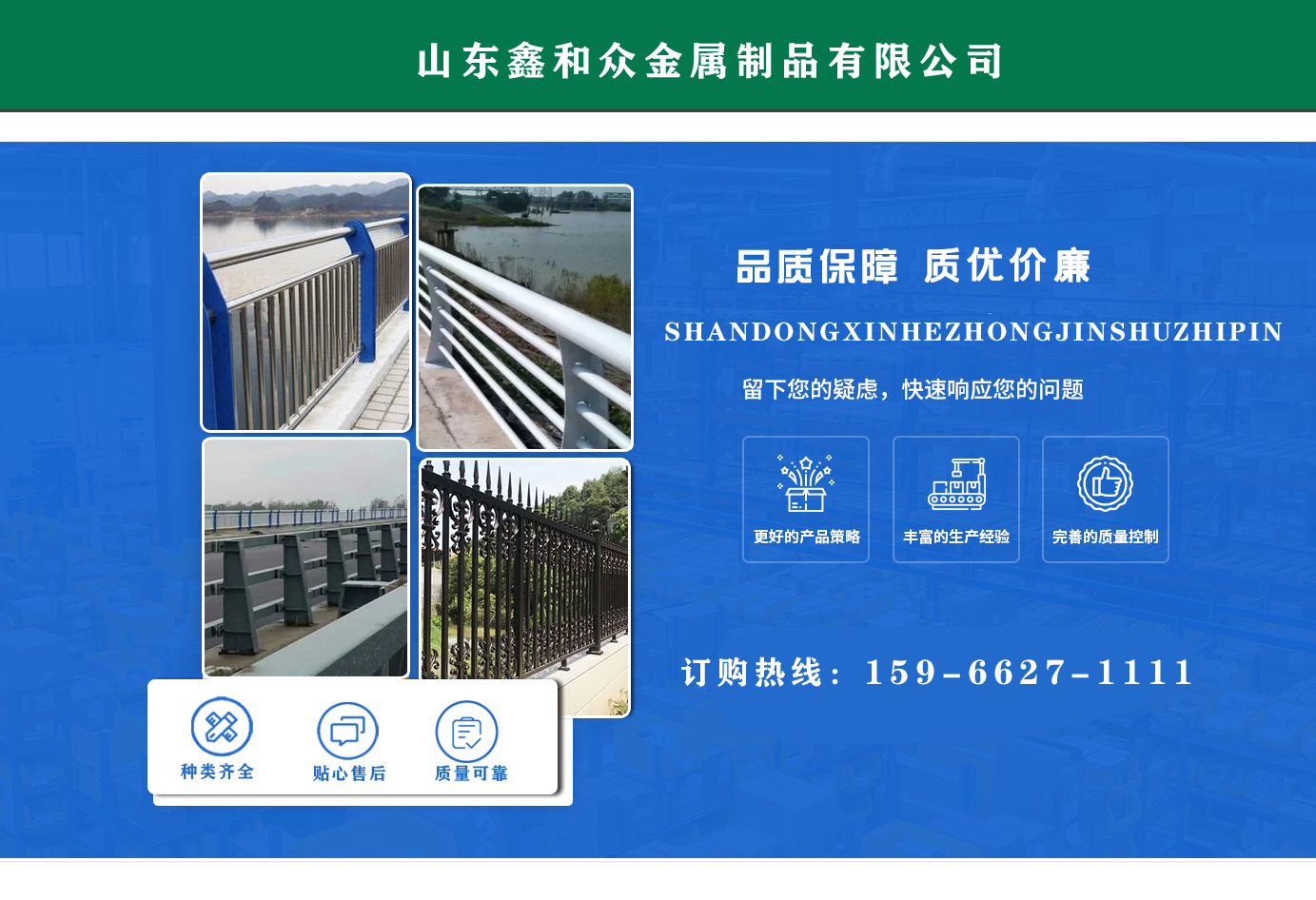 山東鑫和眾金屬制品有限公司主要產(chǎn)品有防撞護(hù)欄,橋梁護(hù)欄,道路護(hù)欄,河道護(hù)欄,不銹鋼護(hù)欄等護(hù)欄。提供設(shè)計(jì)方案,一站式定制,包您滿意價(jià)格優(yōu)惠,歡迎來(lái)電咨詢!    公司常年從事銷售護(hù)欄防撞護(hù)欄,橋梁護(hù)欄,道路護(hù)欄,河道護(hù)欄,不銹鋼護(hù)欄,橋梁鋼護(hù)欄,河道燈光護(hù)欄等。產(chǎn)品廣泛應(yīng)用于橋梁、河道、旅游景區(qū)、道路、公路、公園、小區(qū)、景觀、道路防撞等領(lǐng)域。    公司產(chǎn)品均采用優(yōu)質(zhì)不銹鋼材料,符合相關(guān)標(biāo)準(zhǔn)。各種型號(hào)不銹鋼復(fù)合管及護(hù)欄,質(zhì)量嚴(yán)格把控。產(chǎn)品強(qiáng)度高、耐腐蝕、焊接牢固、抗沖擊、性能好,防撞護(hù)欄結(jié)構(gòu)簡(jiǎn)單、美觀實(shí)用大方?!    g迎前來(lái)訂購(gòu)!...